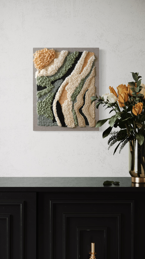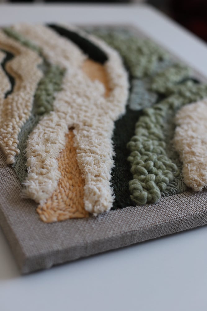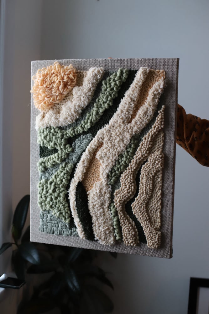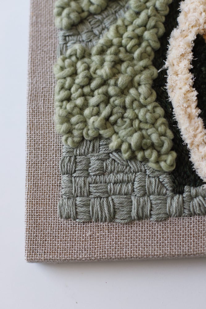 Measures 16/20 wool and recycled cotton cord on linen canvas. Free shipping is available if you local. Just type the word LOCALPICKUP at check out.