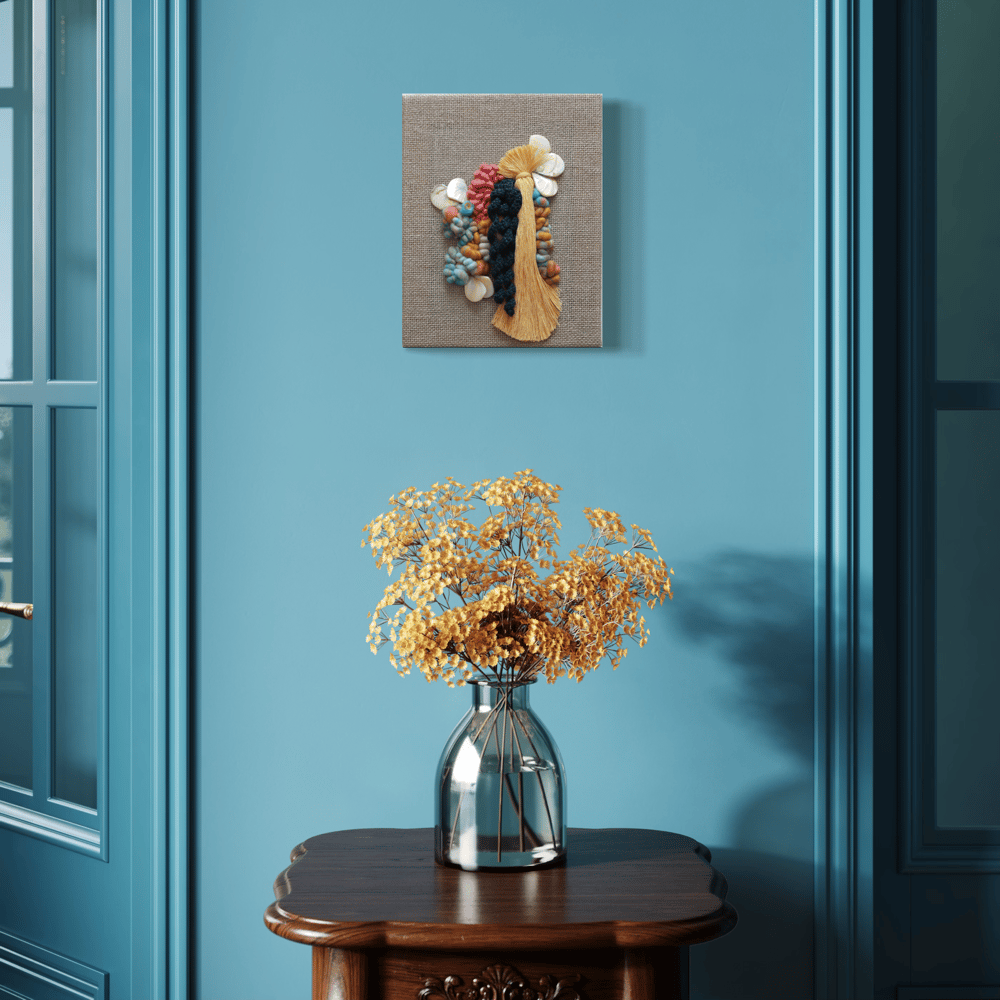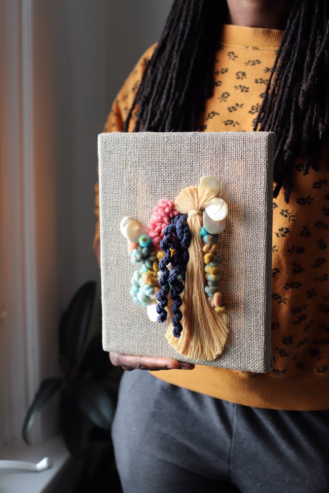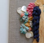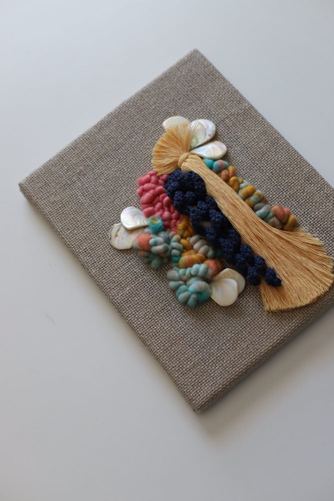 Measures 8/10. Wool , recycled cotton and glass beads on linen canvas