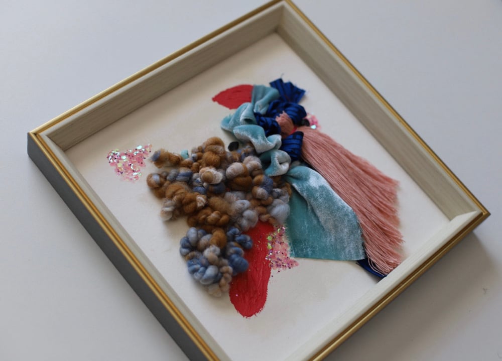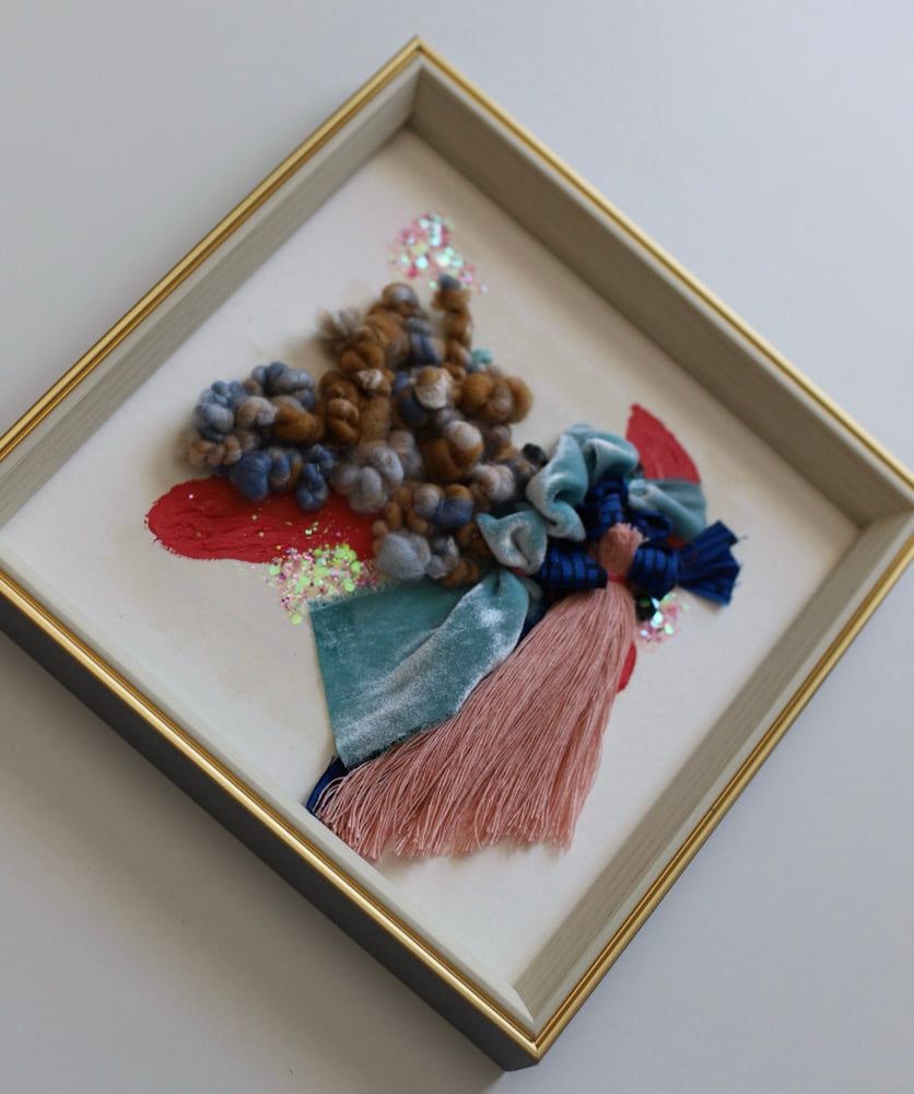 Materials: Wool , recycled cotton, beads, velvet, African print, acrylic paint and a dash of sprinkles on acrylic paper