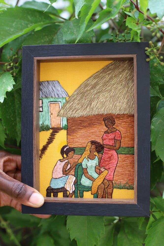 This embroidery piece captures a familiar scene for every African girl, whether a city or village girl. It celebrates the shared rituals that connects us. Getting your hair done is about laughter, sometimes pain, storytelling, but most of all, it’s about sisterhood.
